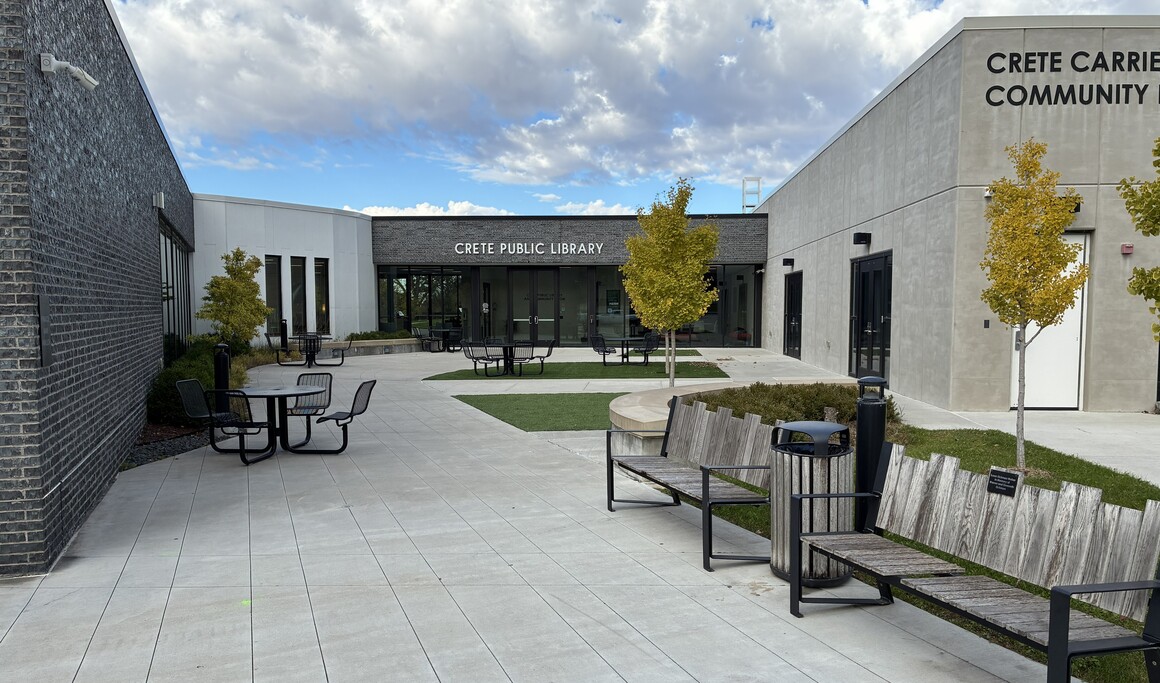 Site visit, May 2: looking north to the community room/shelter entrance and main library entrance at right.