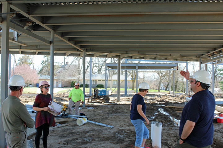 April 8, 2019. Library Director Joy Stevenson, Jim Crouse, Council member Ryan Hinz, and Library Advisory Board member Jan Sears see the construction progress at the new library site.